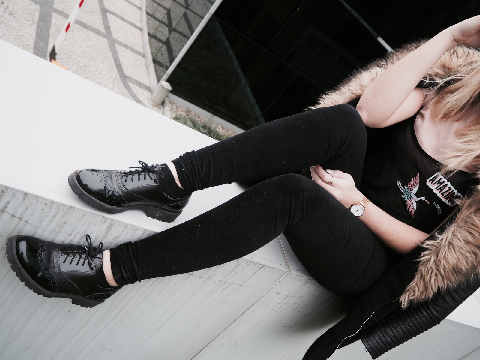 Hoje venho propor um look pra vestir ainda na época de Outono. Visto que nesta altura ainda se pode usar umas t-shirts, sim é só preciso saber combinar com uma casaca quentinha. Fiquei logo apaixonada por esta T-shirt, simples e ao mesmo tempo diferente das outras pois tem um toque irreverente com um autocolante . Neste look onde domina o preto decidi combinar esta casaca com pelo falso, juntamente com umas calças pretas em velvet que neste momento está muito na moda (o tecido ). E pra finalizar decidi usar estes sapatos clássicos em laca.